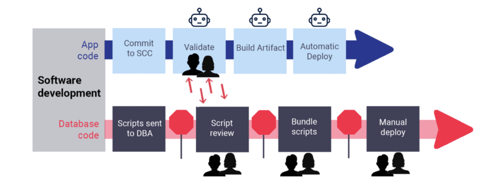 Since database changes follow a manual process, requests for database code reviews are often the last thing holding up a release. Developers understandably get frustrated because the code they wrote a few weeks ago is still in review. The whole database change process is just a blocker.